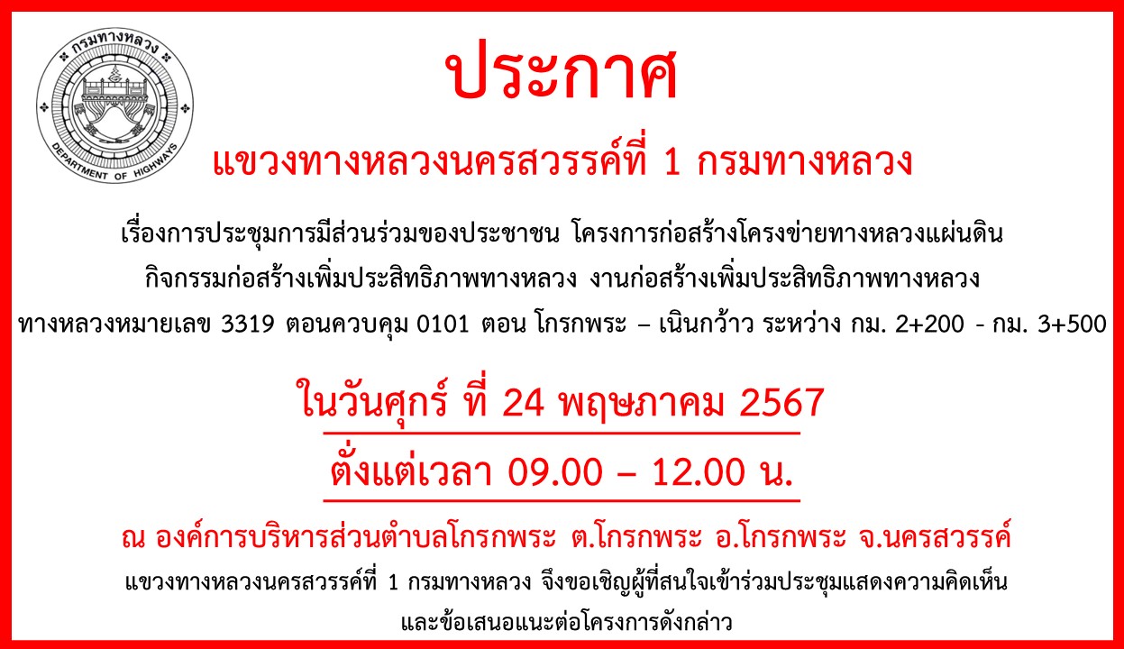 การประชุมการมีส่วนร่วมของประชาชน โครงการก่อสร้างโครงข่ายทางหลวงแผ่นดิน กิจกรรมก่อสร้างเพิ่มประสิทธิภาพทางหลวง งานก่อสร้างเพิ่มประสิทธิภาพทางหลวง ทางหลวงหมายเลข 3319 ตอนควบคุม 0101 ตอน โกรกพระ – เนินกว้าว ระหว่าง กม. 2+200 - กม. 3+500