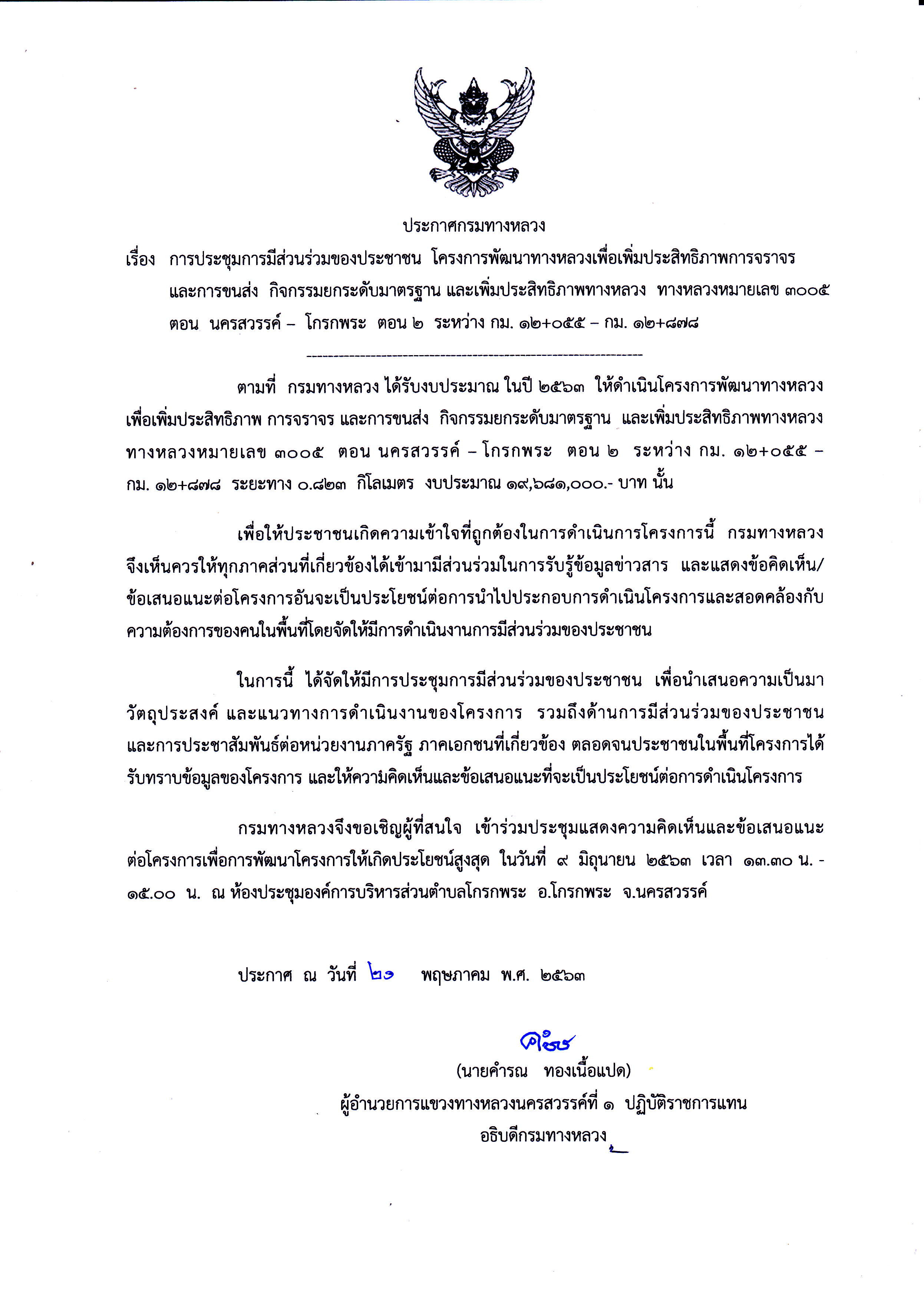 ข่าวประชาสัมพันธ์ กิจกรรมยกระดับมาตรฐานและเพิ่มประสิทธิภาพทางหลวง ทล.3005 ตอน นครสวรรค์ - โกรกพระ ตอนที่ 2 กม.12+055 - กม.12+878