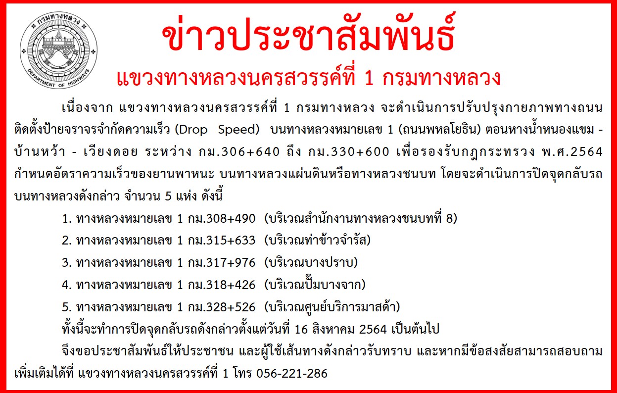 ข่าวประชาสัมพันธ์ เนื่องจาก แขวงทางหลวงนครสวรรค์ที่ 1 กรมทางหลวง จะดำเนินการปรับปรุงกายภาพทางถนน ติดตั้งป้ายจราจรจำกัดความเร็ว (Drop Speed) บนทางหลวงหมายเลข 1 (ถนนพหลโยธิน) ตอนหางน้ำหนองแขม - บ้านหว้า - เวียงดอย ระหว่าง กม.306+640 ถึง กม.330+600