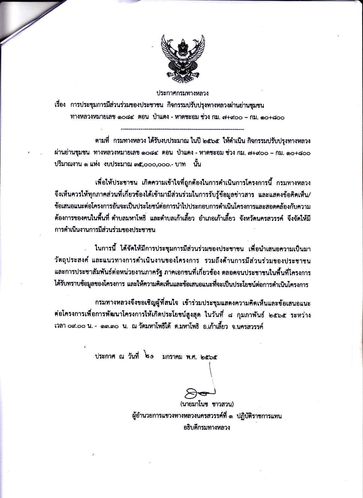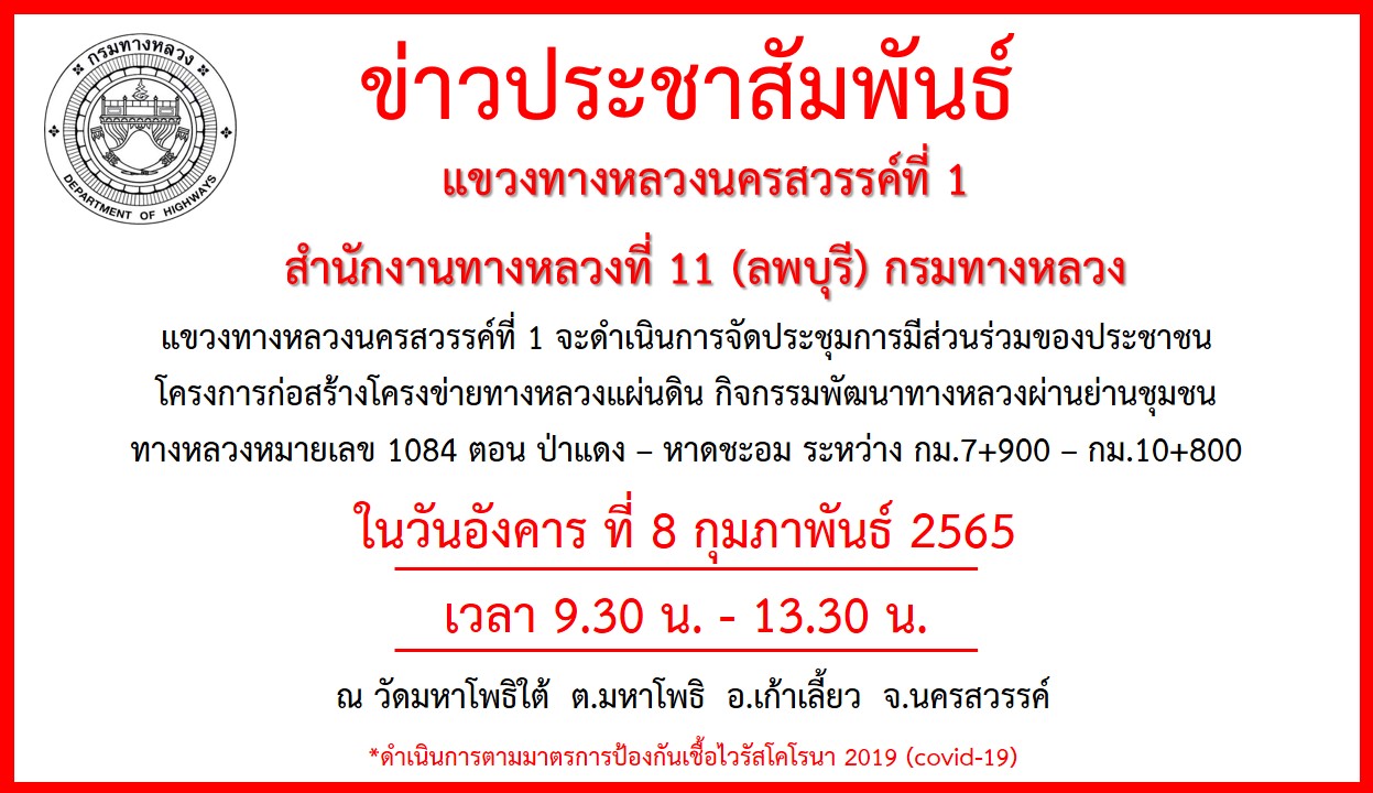 ประกาศแขวงทางหลวงนครสวรรค์ที่ 1 การประชุมการมีส่วนร่วมของประชาชน วันที่ 8 กุมภาพันธ์ 2565