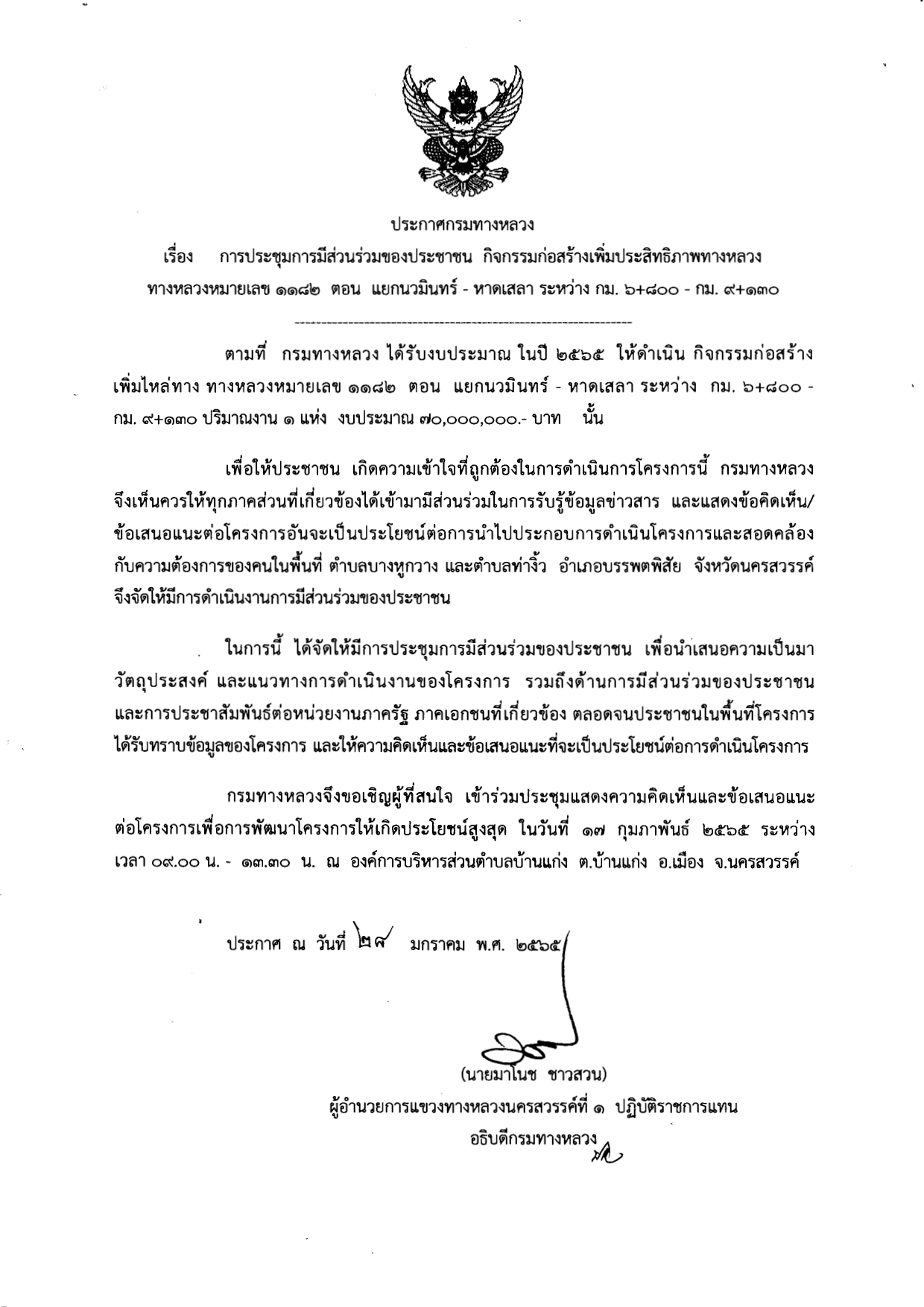ประกาศแขวงทางหลวงนครสวรรค์ที่ 1 การประชุมการมีส่วนร่วมของประชาชน วันที่ 17 กุมภาพันธ์ 2565