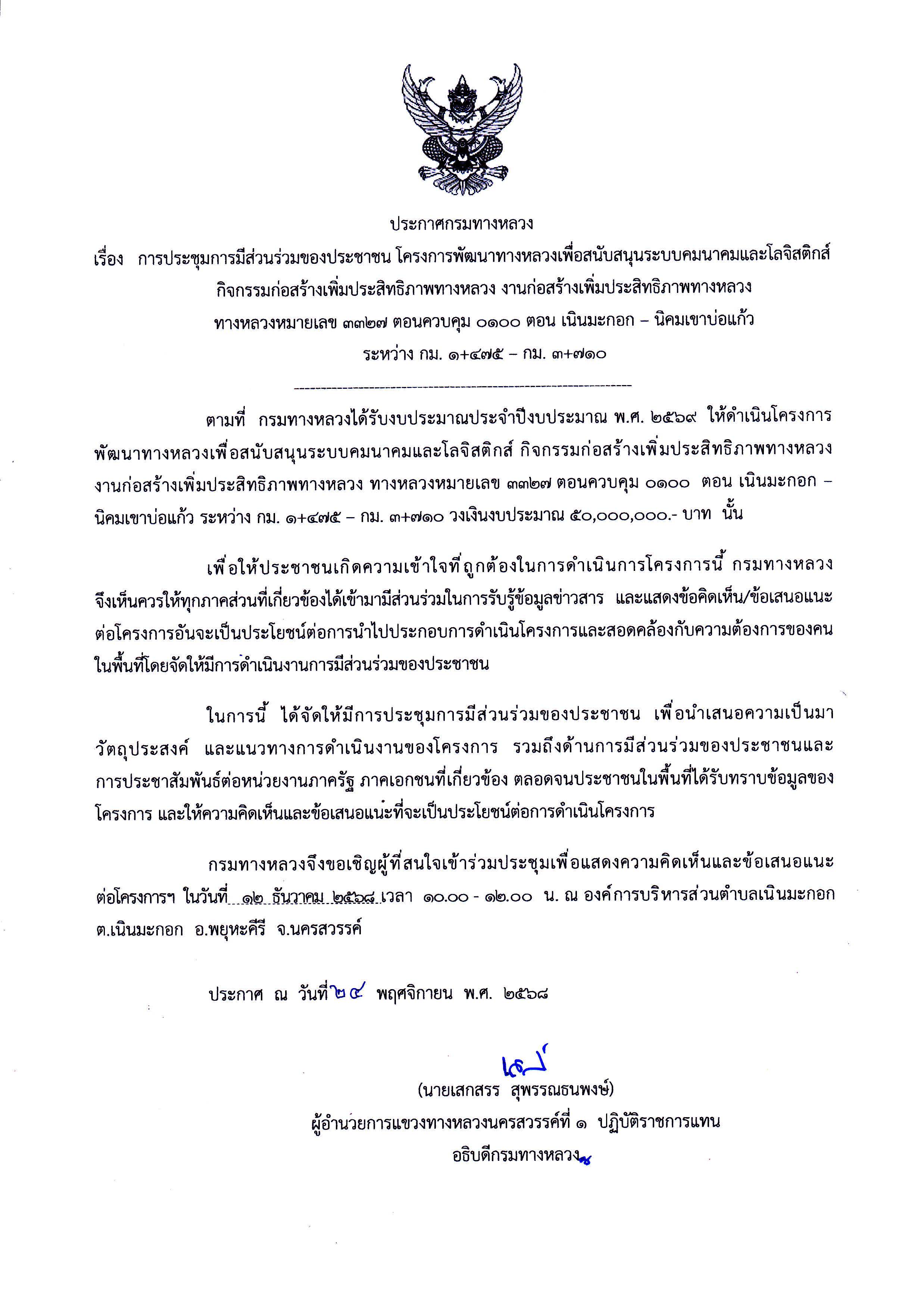 การประชุมการมีส่วนร่วมของประชาชน โครงการพัฒนาทางหลวงเพื่อสนับสนุนระบบคมนาคมและโลจิสติกส์ กิจกรรมก่อสร้างเพิ่มประสิทธิภาพทางหลวง งานก่อสร้างเพิ่มประสิทธิภาพทางหลวง ทางหลวงหมายเลข 3327 ตอนควบคุม 0100 ตอน เนินมะกอก - นิคมเขาบ่อแก้ว ระหว่าง กม. 1+475 - กม. 3+710