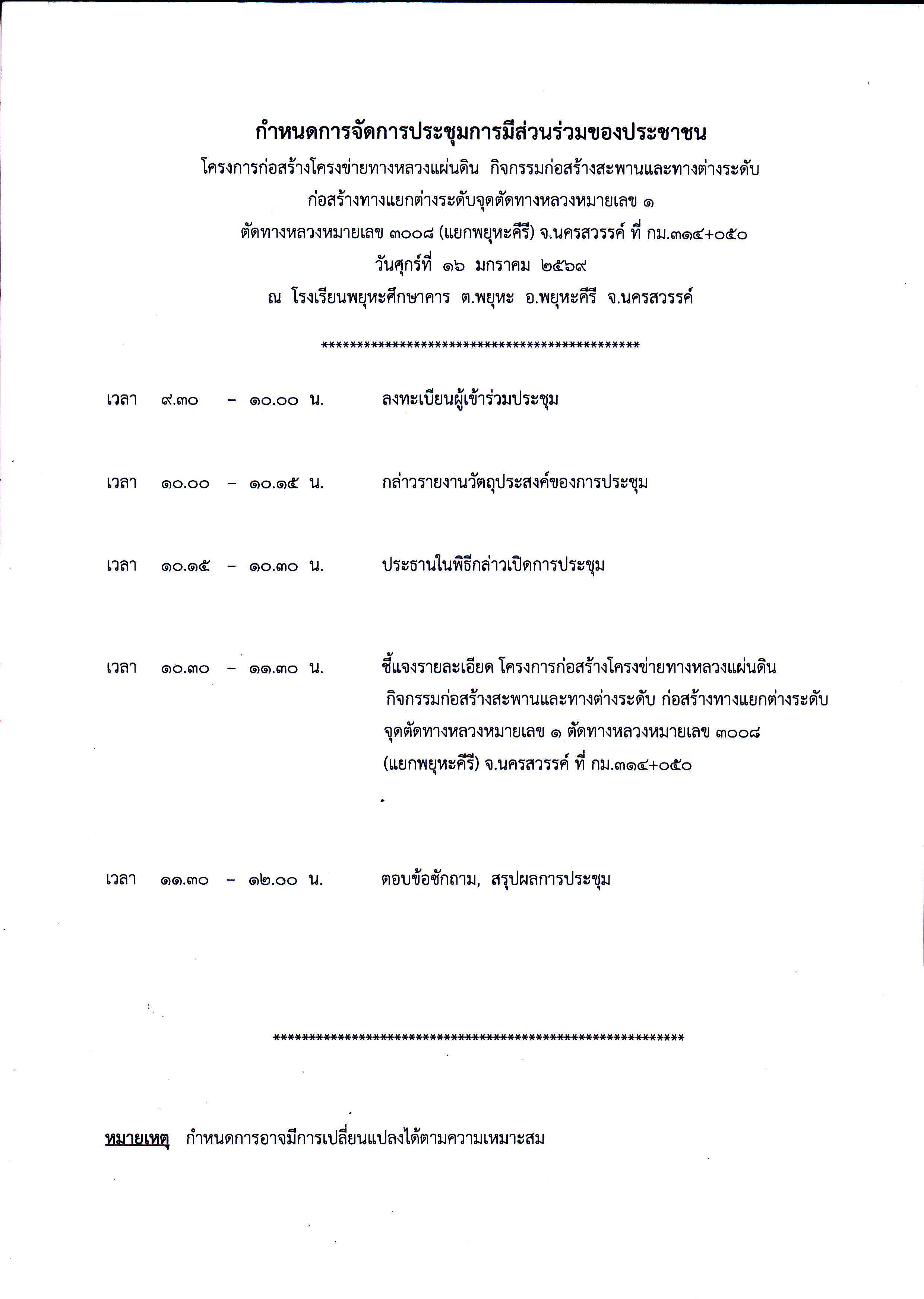 การประชุมการมีส่วนร่วมของประชาชน โครงการก่อสร้างโครงข่ายทางหลวงแผ่นดิน กิจกรรมก่อสร้างสะพานและทางต่างระดับ ก่อสร้างทางแยกต่างระดับจุดตัดทางหลวงหมายเลข 1 ตัดทางหลวงหมายเลข 3008 (แยกพยุหะคีรี) จ.นครสวรรค์ ที่ กม.314+050