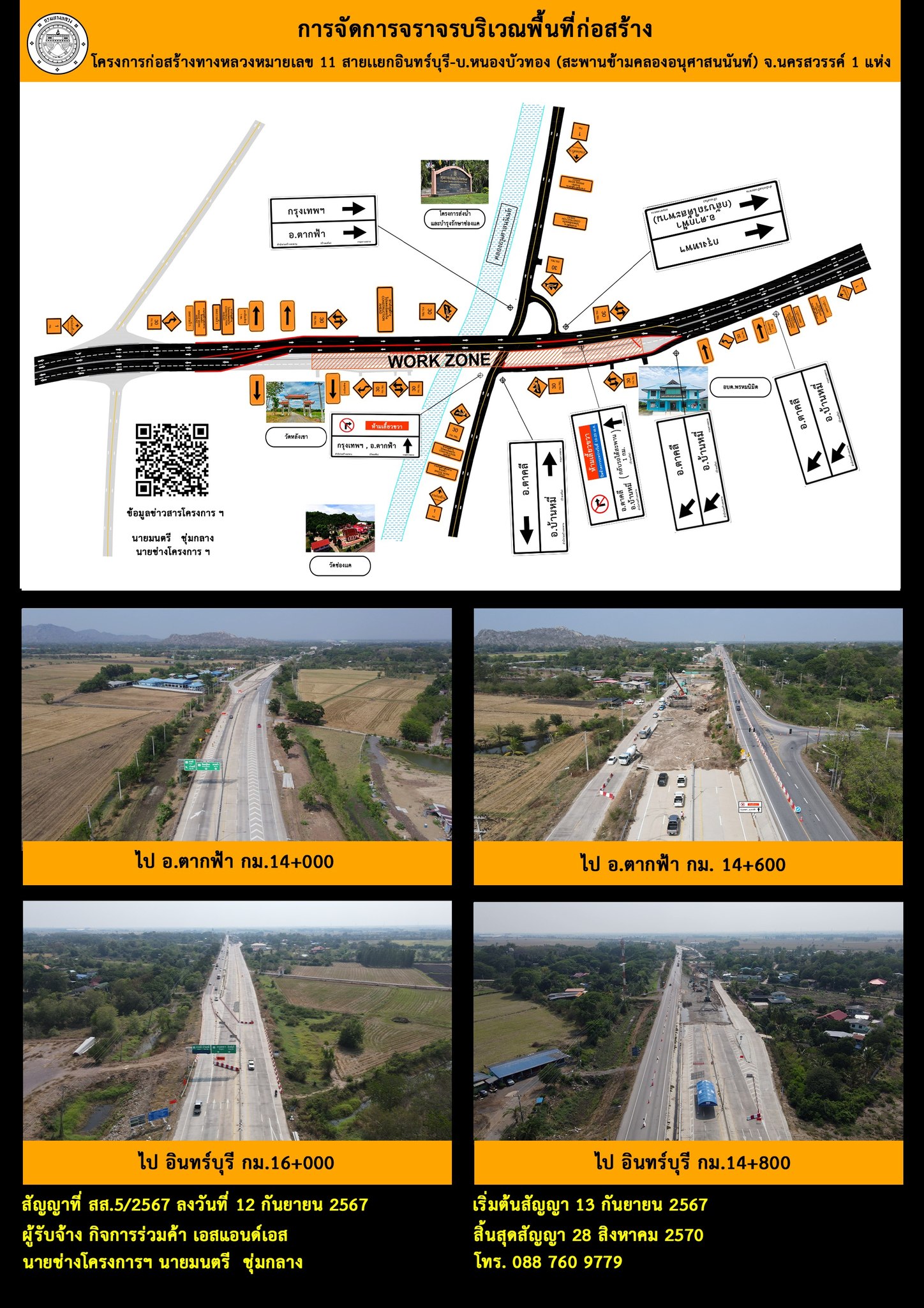 แผนผังทางเบี่ยงการจราจร การก่อสร้างทางหลวงหมายเลข 11 สายแยกอินทร์บุรี - บ.หนองบัวทอง (สะพานข้ามคลองอนุศาสนนันท์) ช่วงเทศกาลสงกรานต์ ระหว่างวันที่ 11 - 17 เมษายน 2568