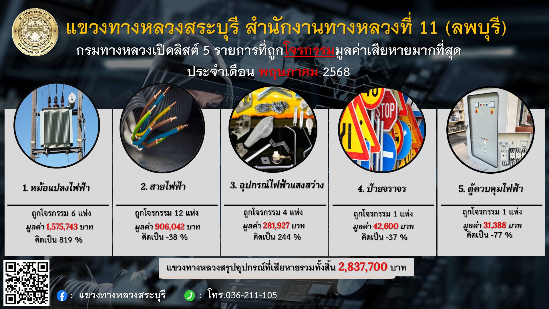 แขวงทางหลวงสระบุรี ขอรายงานทรัพย์สินของแขวงทางหลวงที่ถูกการโจรกรรม ประจำเดือน มิถุนายน 2568