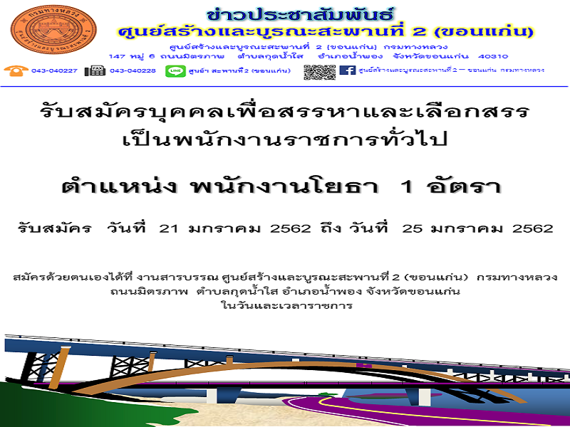 ข้อมูลประกาศรับสมัครพนักงานราชการ : รับสมัครบุคคลเพื่อสรรหาและเลือกสรรเป็นพนักงานราชการทั่วไป ตำแหน่ง พนักงานโยธา 1 อัตรา