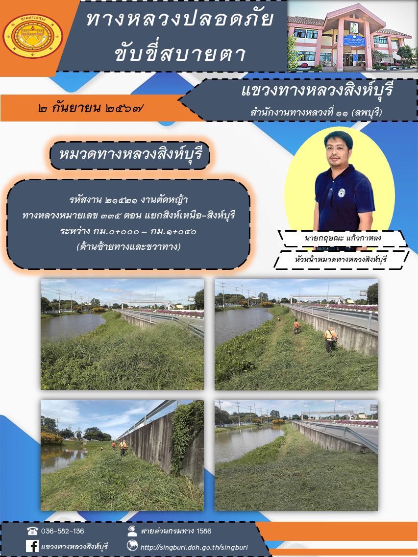 ข้อมูลภาพกิจกรรม : ??ประชาสัมพันธ์ วันจันทร์ที่ 2 กันยายน 2567 ผลการปฏิบัติงาน ตั้งแต่วันที่ 26-30 สิงหาคม 2567 แขวงทางหลวงสิงห์บุรี