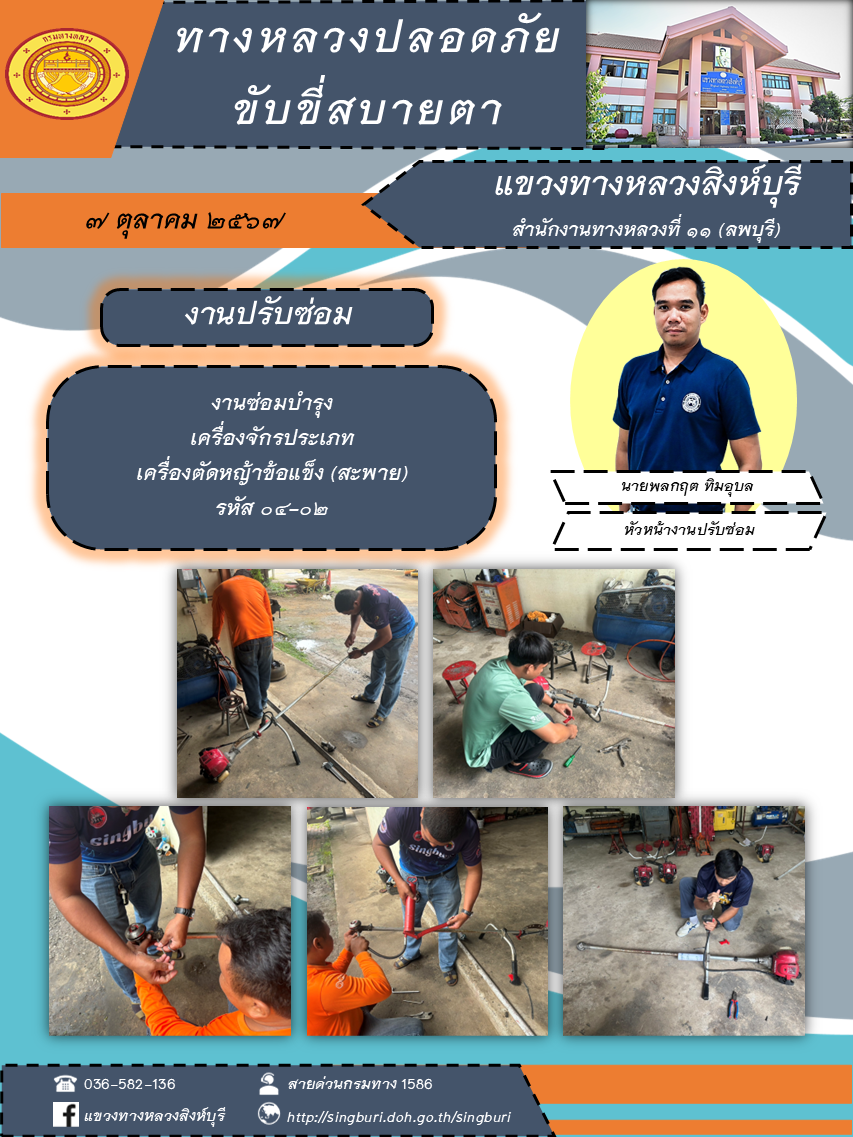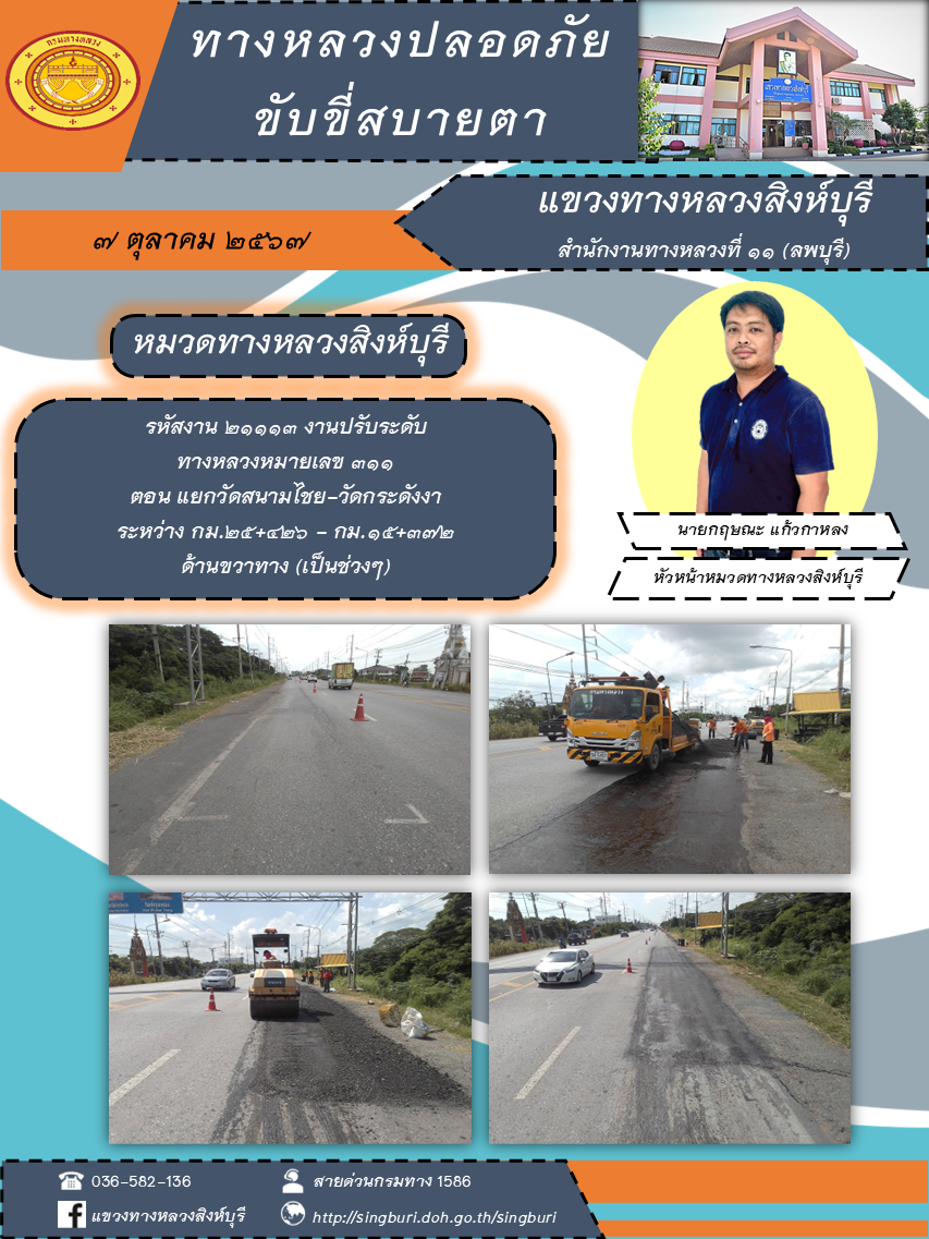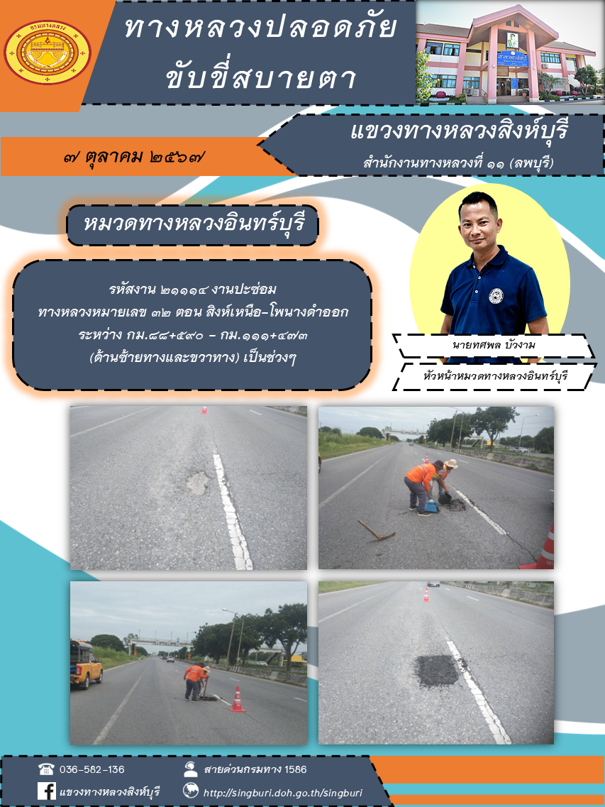 ข้อมูลภาพกิจกรรม : ผลการปฏิบัติงาน ตั้งแต่วันที่ 30 กันยายน ถึง 4 ตุลาคม2567 แขวงทางหลวงสิงห์บุรี