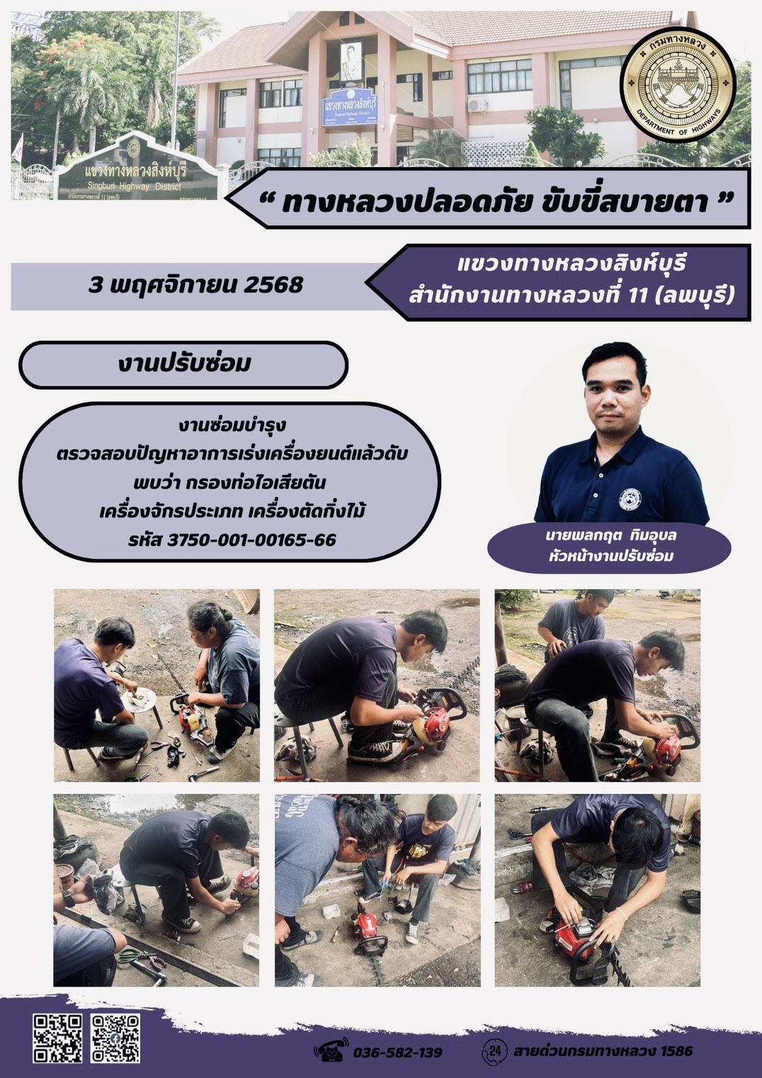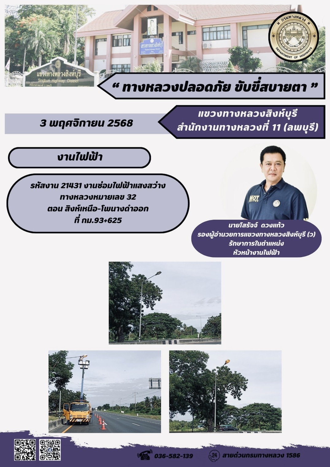 ผลการปฏิบัติงานวันที่ 23-29 ตุลาคม 2568 แขวงทางหลวงสิงห์บุรี สำนักงานทางหลวงที่ 11(ลพบุรี) กรมทางหลวง