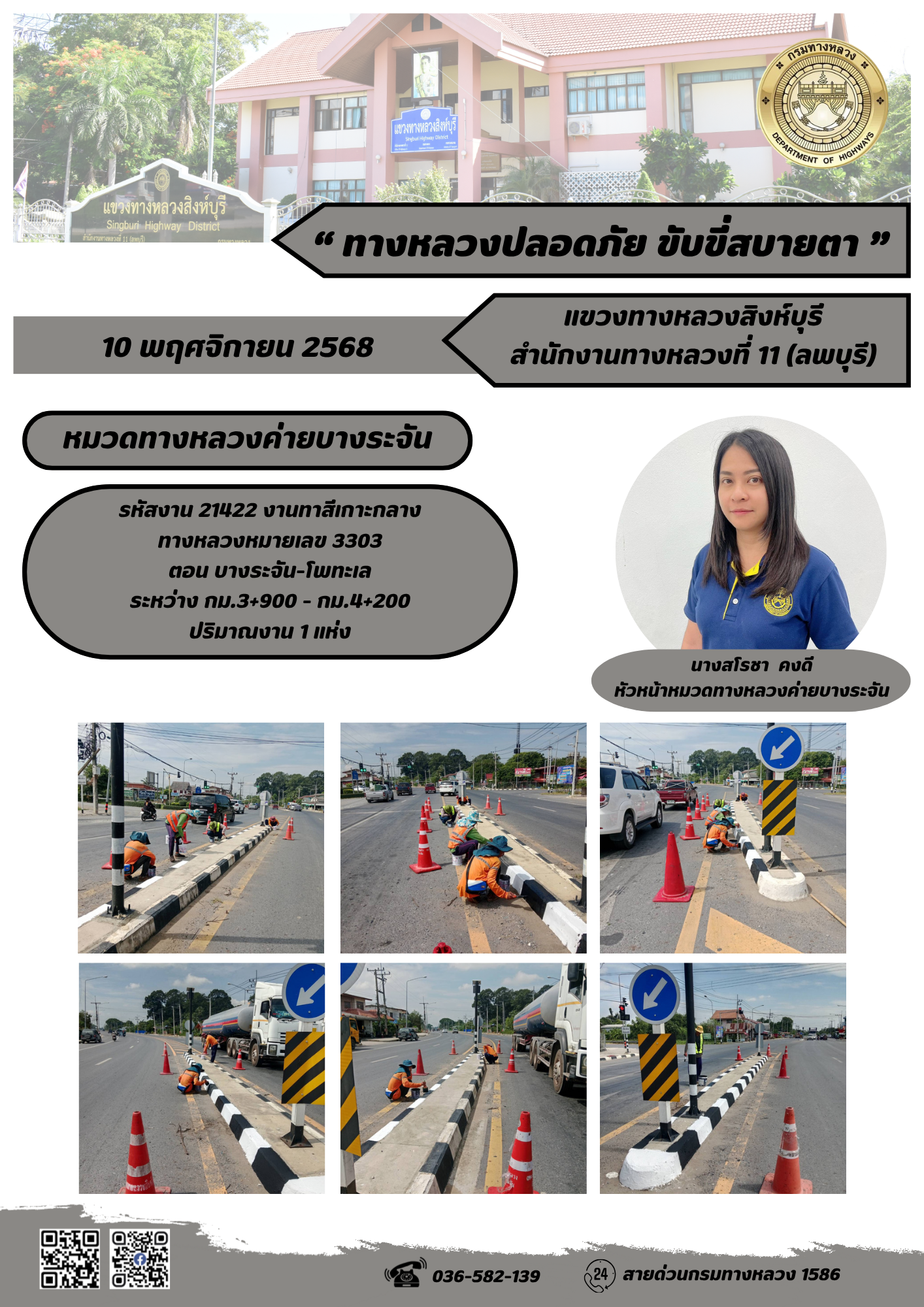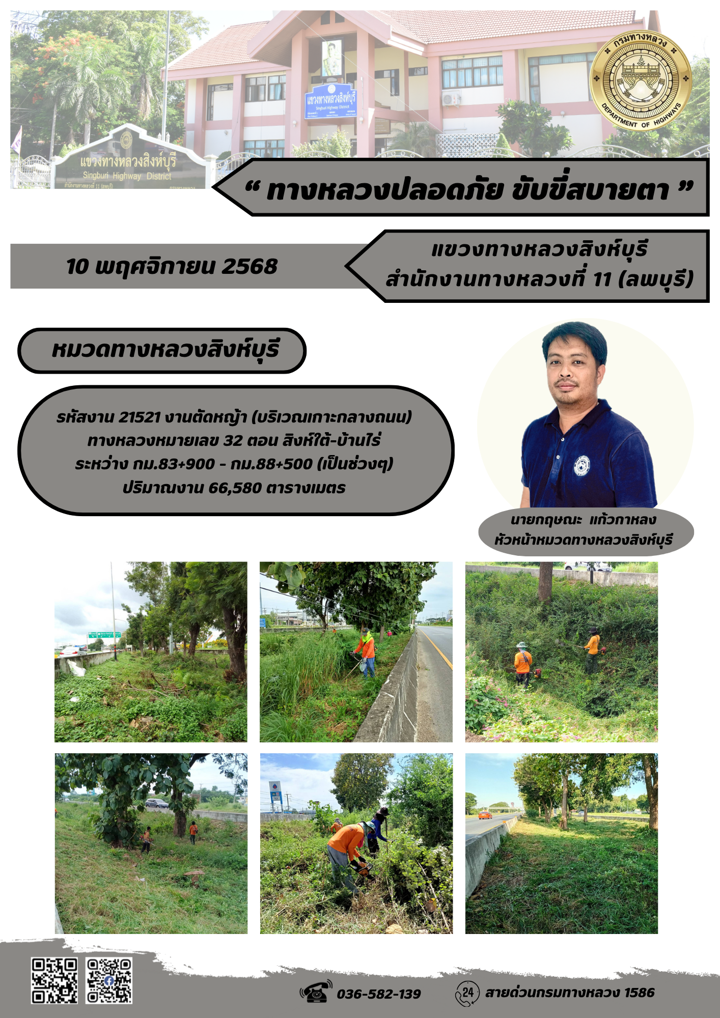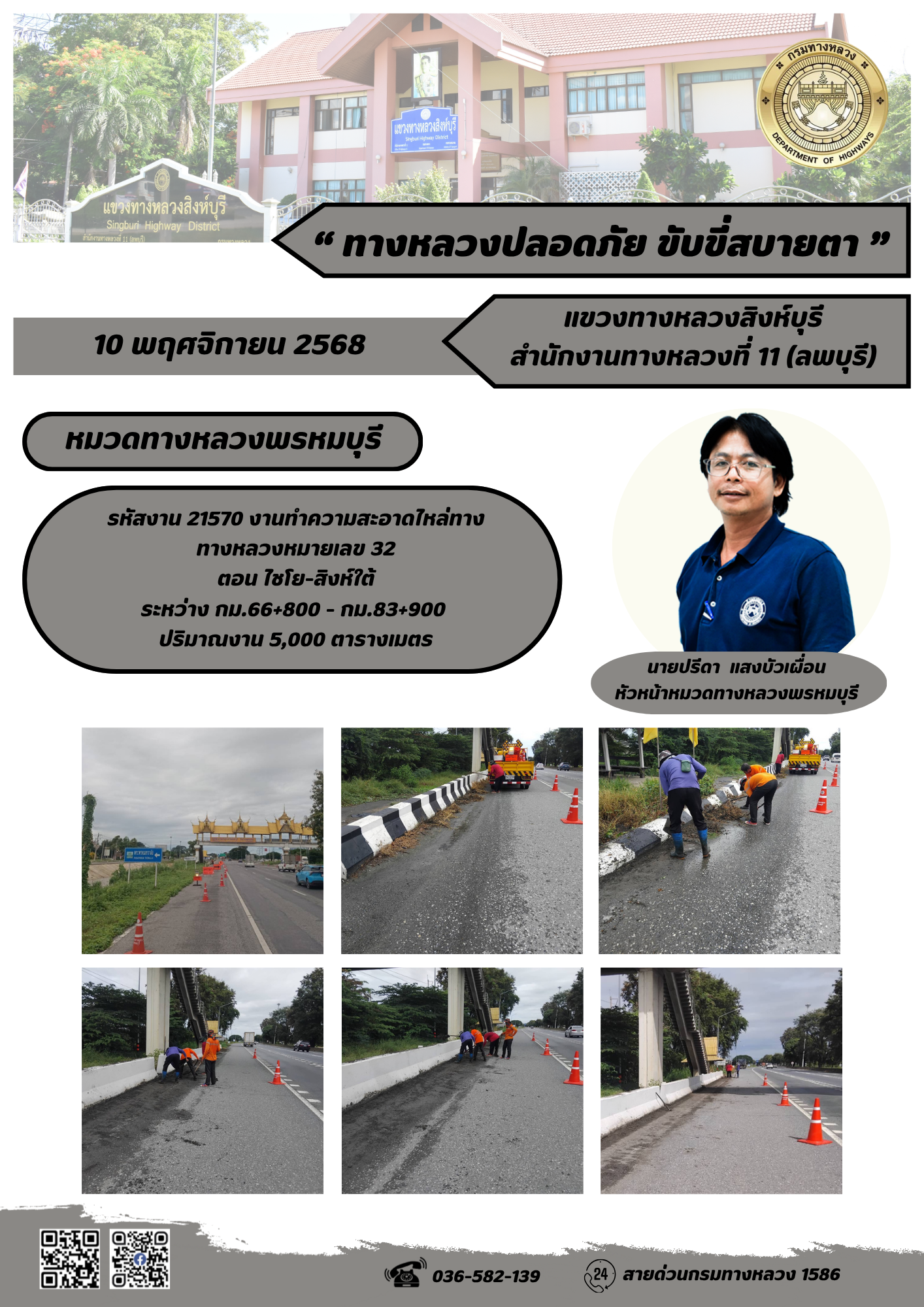 ผลการปฏิบัติงานวันที่ 30 ต.ค. - 5 พ.ย. 2568 แขวงทางหลวงสิงห์บุรี สำนักงานทางหลวงที่ 11(ลพบุรี) กรมทางหลวง