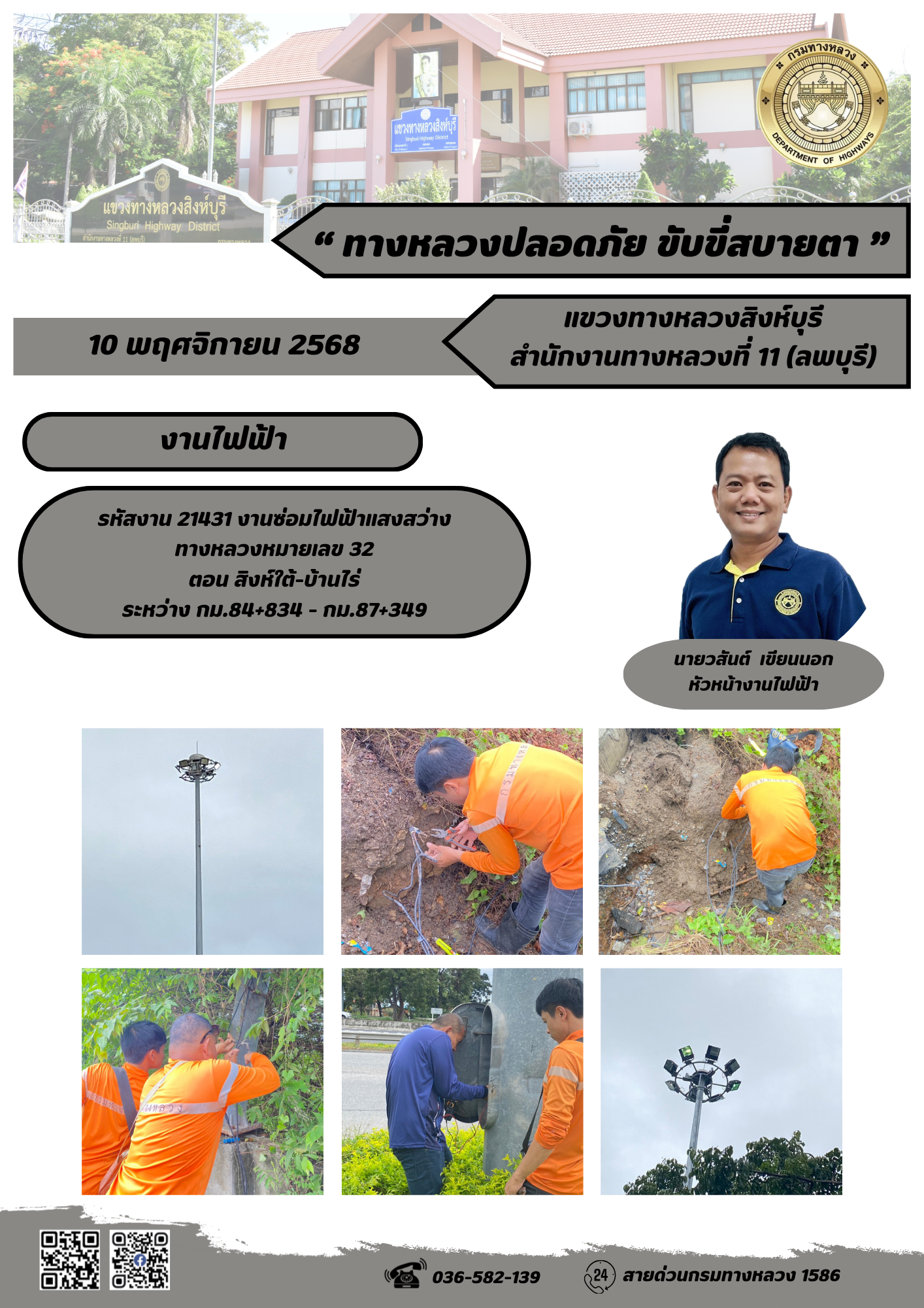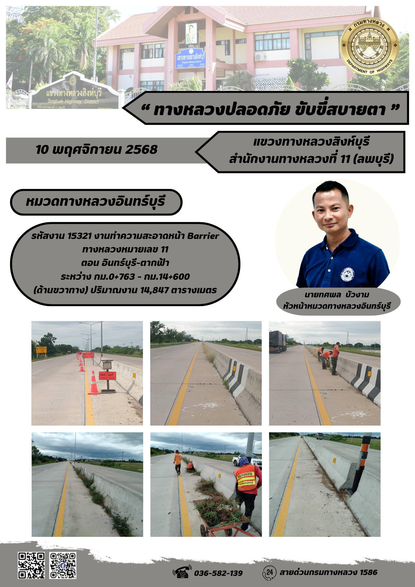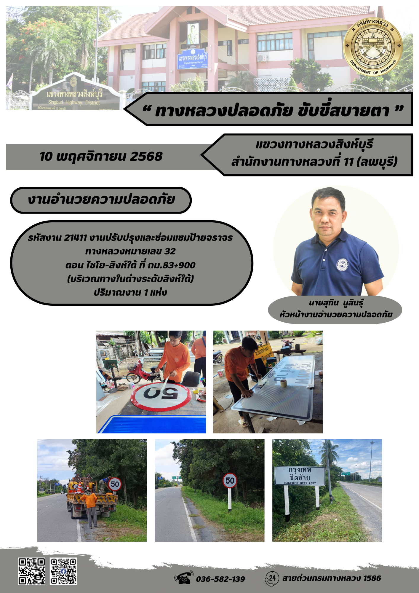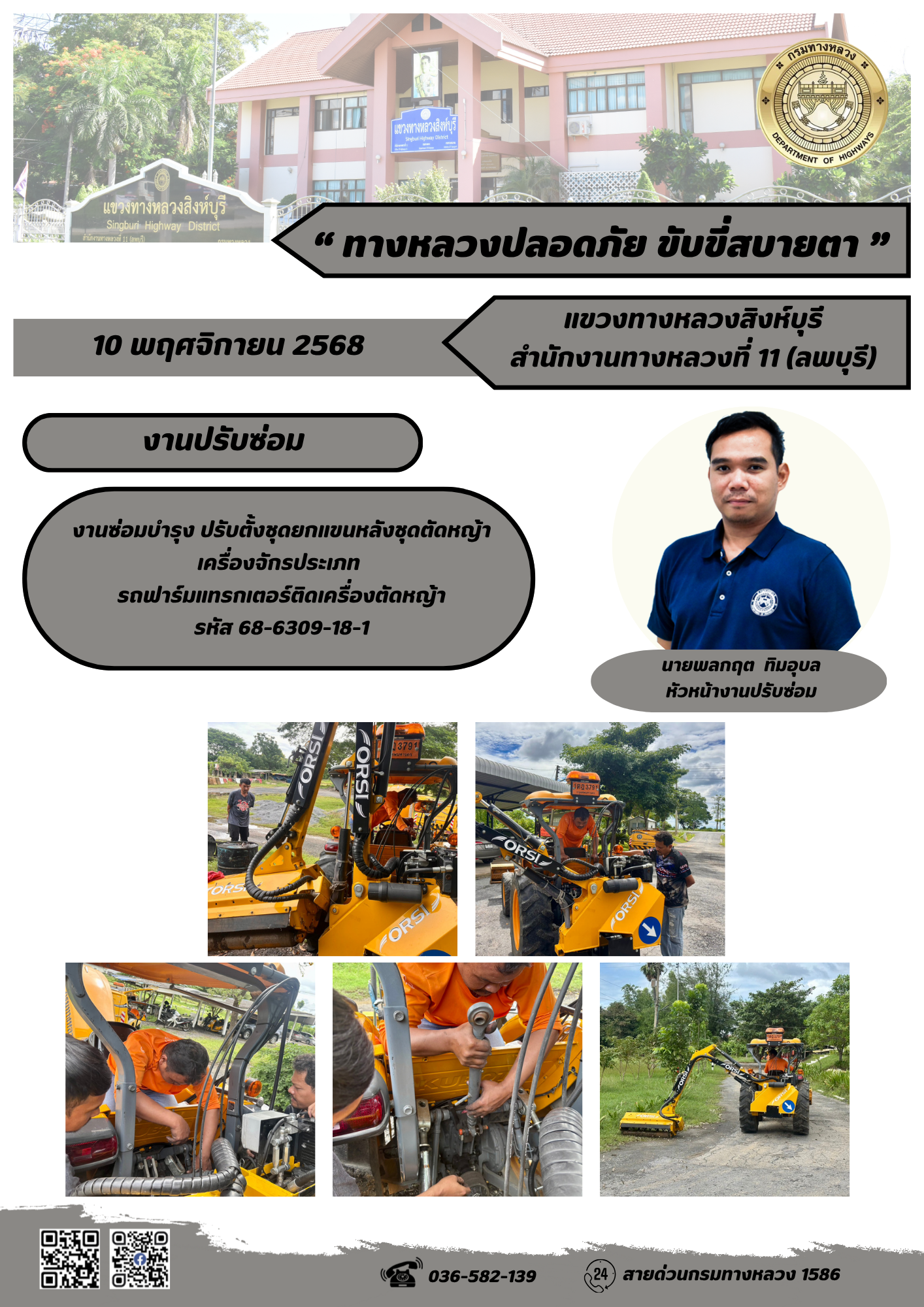 ผลการปฏิบัติงานวันที่ 30 ต.ค. - 5 พ.ย. 2568 แขวงทางหลวงสิงห์บุรี สำนักงานทางหลวงที่ 11(ลพบุรี) กรมทางหลวง