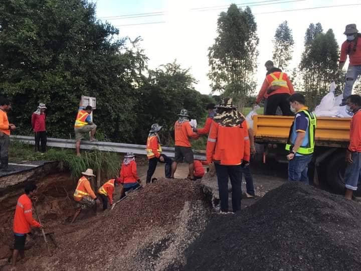 - ดำเนินการขุดลอกวัชพืชเปิดทางน้ำสองข้างทาง และเรียงกระสอบทรายซ่อมแซมจุดรั่วซึมที่เรียงไว้ และติดตั้งเครื่องสูบน้ำเพื่อเร่งระบายน้ำออกจากทางหลวงและบ้านเรือนประชาชน